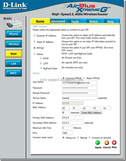 Cari menu WAN pada router wifi, dan pilih PPPoE, setelah itu isi user account speedy(lihat gambar di bawah). Untuk DNS saya gunakan DNS google supaya lebih simple dan gampang diingat, kalau menghendaki DNS Telkom silahkan di google saja.